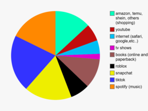 My TikTok YouTube and Phone usage are close. I also use Netflix, Reading, Hulu, Crunchyroll, Video Games, and Movies less than I spend on TikTok and Youtube. Mine is different from Troop 1076 because I use my phone a little bit more and I don’t have music or magazines on my pi chart.