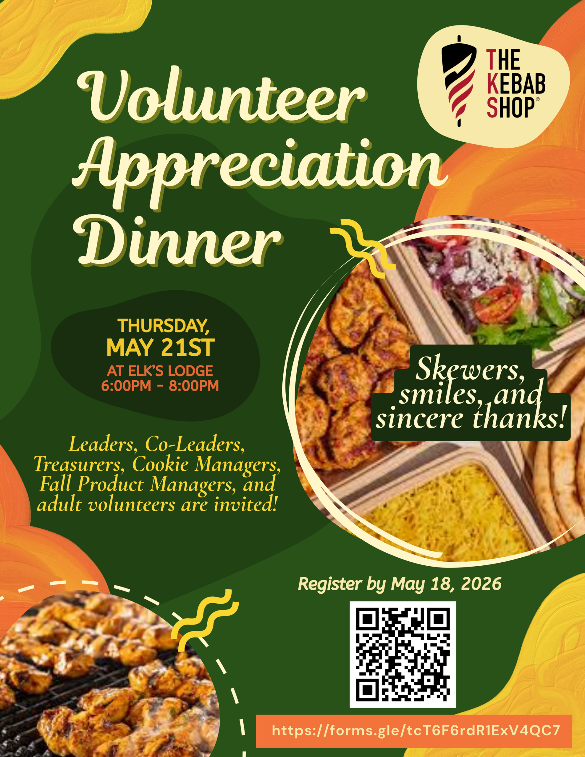 Join us for a special evening celebrating YOU! We’re hosting a Volunteer Appreciation Dinner at the Elk’s Lodge on Thursday, May 21st from 6–8 PM.