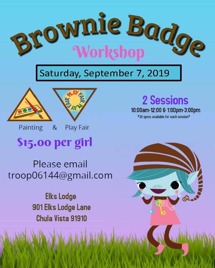 Troop 6144 will be hosting a Brownie Badge Workshop on Saturday, September 7th at the Elks Lodge Park in Chula Vista. Girls who attend will complete the requirements for the Painting and Play Fair badges. Cost is $15 a girl. Please email troop06144@gmail.com to sign up!